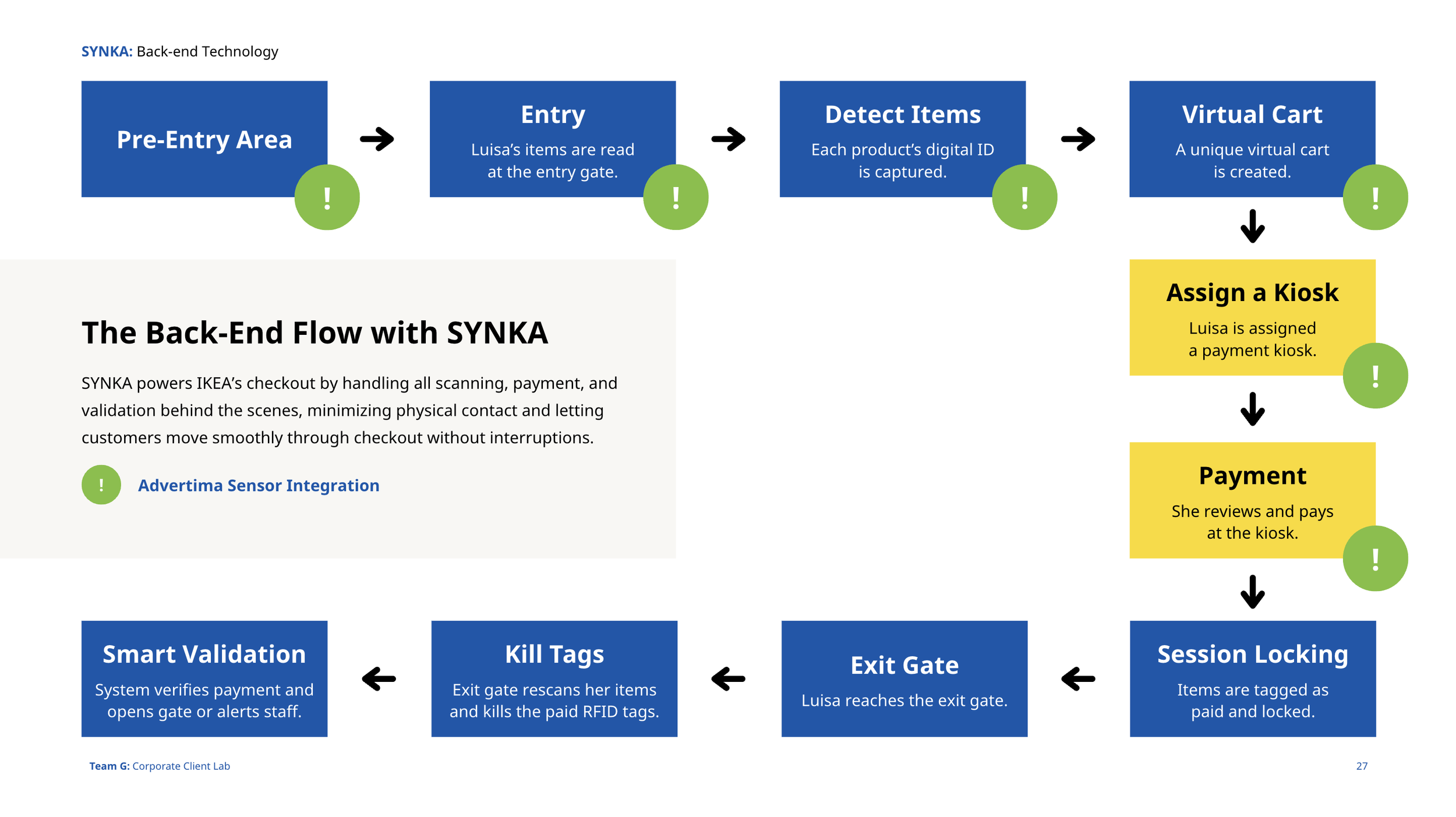 We proposed SYNKA, a scanless checkout experience powered by RFID technology. Instead of manually scanning barcodes, customers would place items in their carts and pass through RFID-enabled gates. Each gate would detect products automatically and assign a payment kiosk for review. The process would integrate with the IKEA Family app, syncing purchases and loyalty rewards. For bulky items, RFID product cards would be issued and encoded by staff, ensuring that the entire range of inventory could be covered.